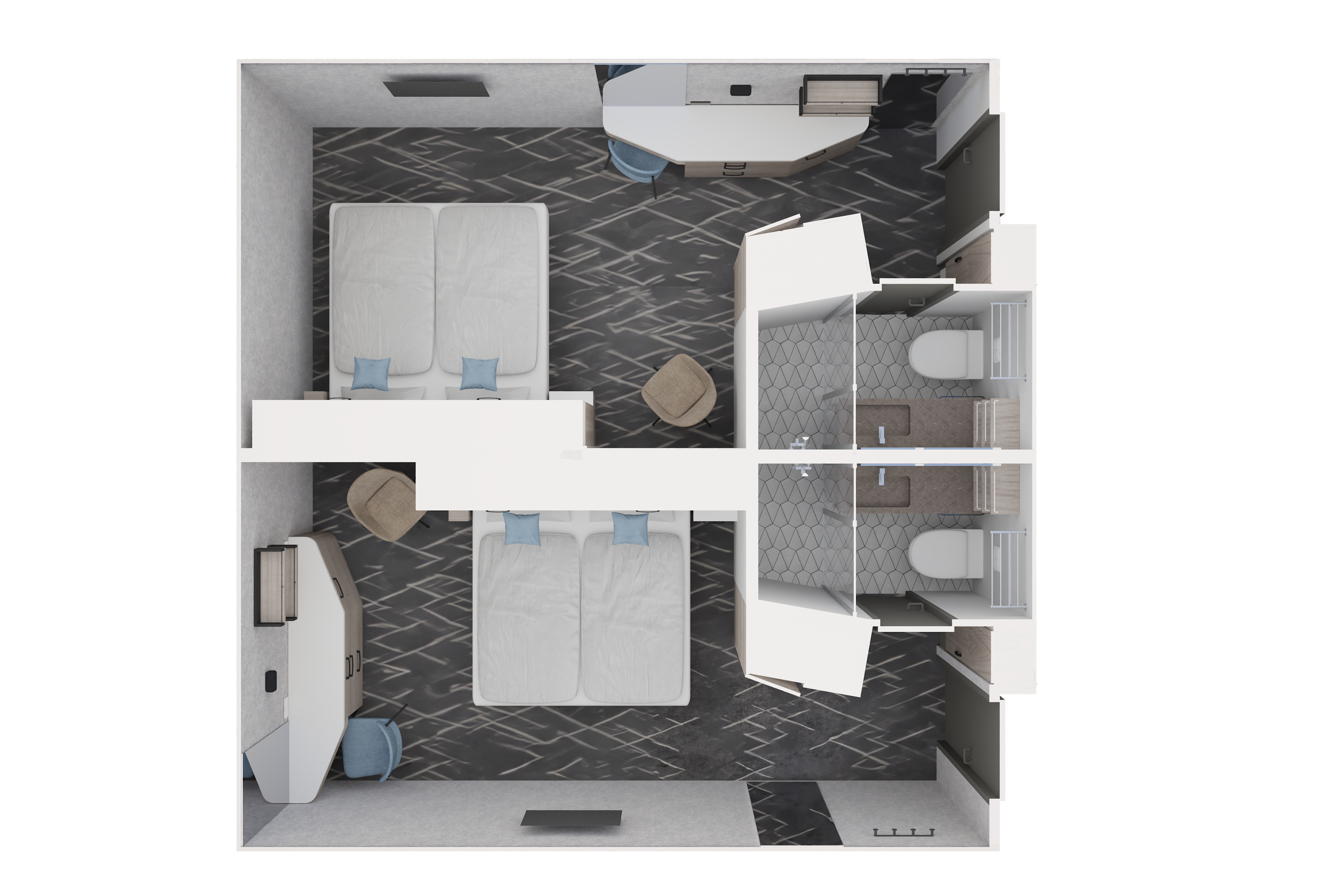 Machen Sie sich schon jetzt ein Bild Ihrer Innenkabine auf der Mein Schiff Flow. Die Aufteilung und Ausstattung der Kabinen und Badezimmer kann im Einzelfall abweichen.