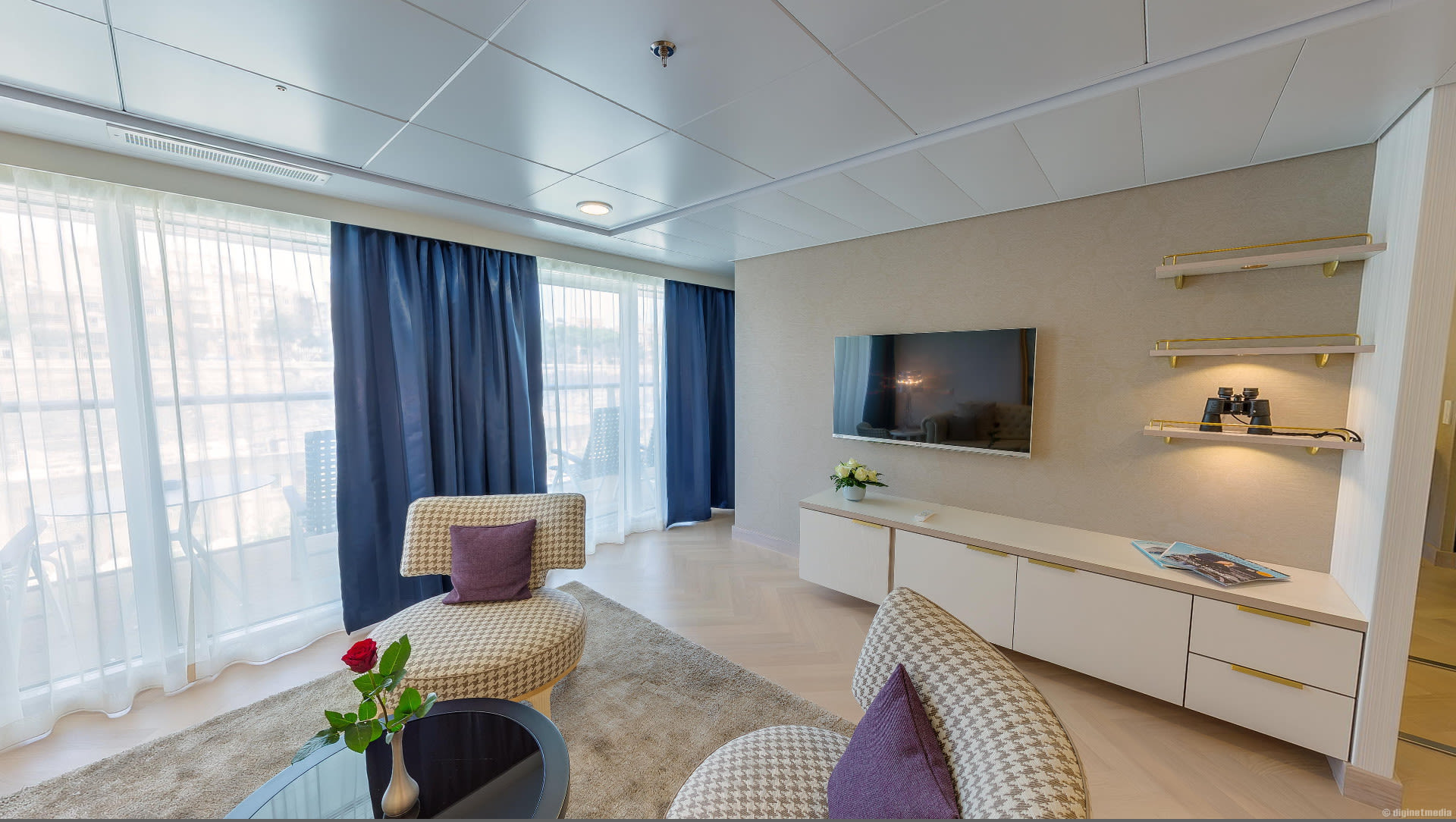 Entdecken Sie die Themen Suite auf der Mein Schiff 3 im interaktiven 360° Rundgang oder durch den Grundriss. Die Aufteilung und Ausstattung der Kabinen und Badezimmer kann im Einzelfall abweichen.