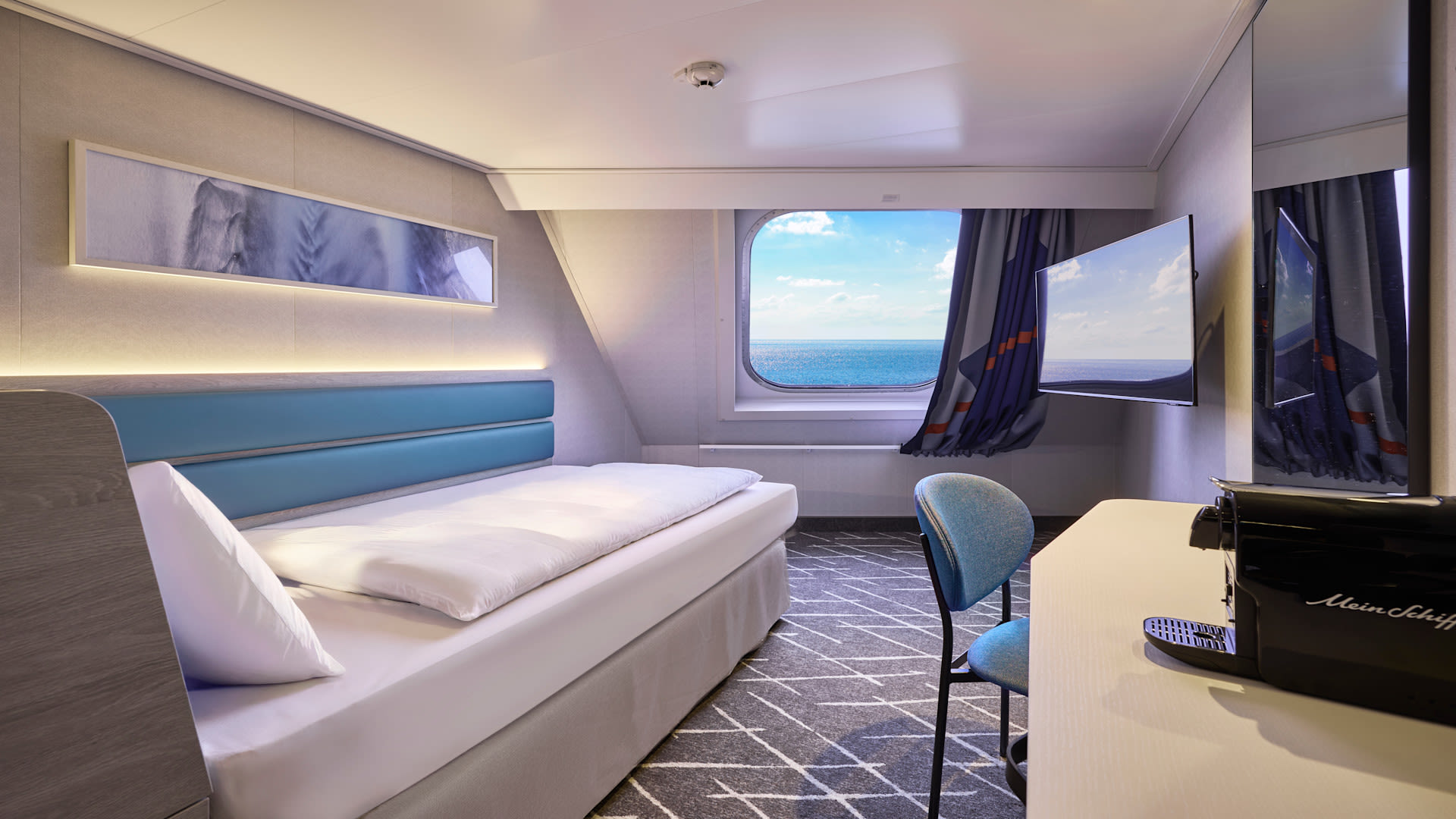 Machen Sie sich schon jetzt ein Bild Ihrer Einzelkabine Außen auf der Mein Schiff Relax. Die Aufteilung und Ausstattung der Kabinen und Badezimmer kann im Einzelfall abweichen.